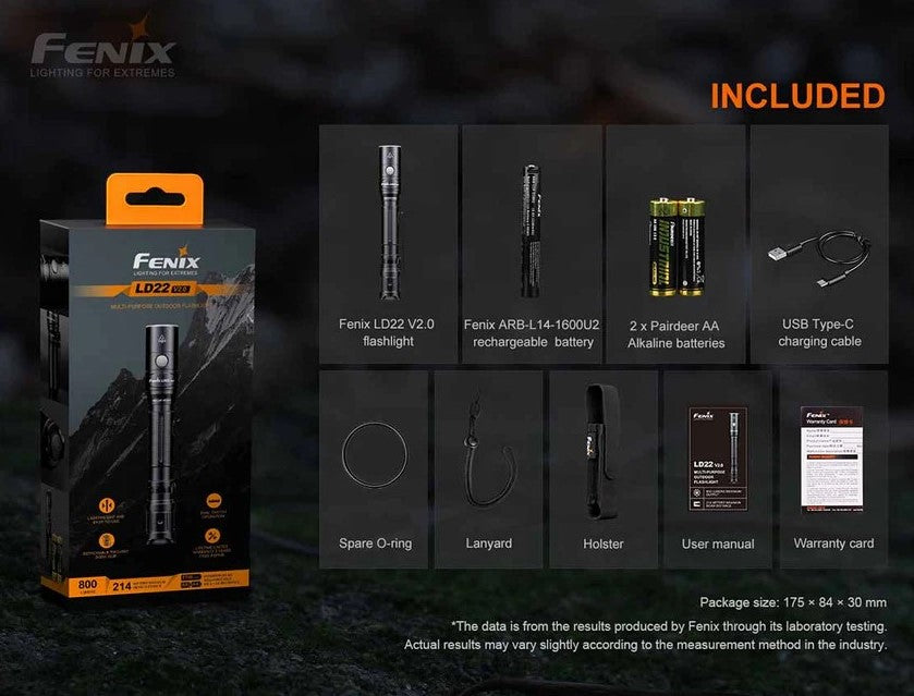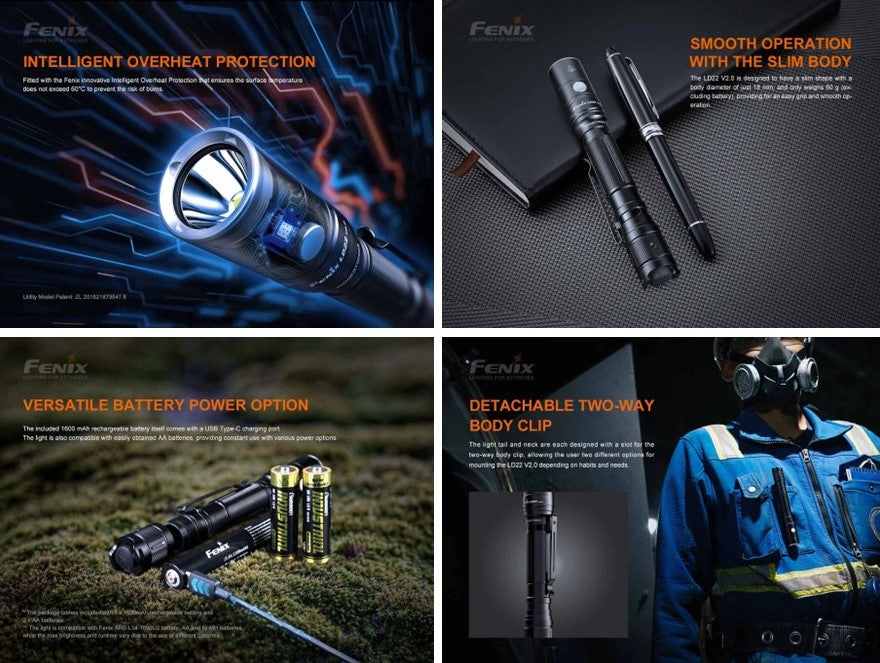 The upgraded Fenix LD22 V2.0 is a multi-use flashlight with a slim body design, multiple power options and great performance—perfect for just about every lighting task. This AA battery powered flashlight now includes a rechargeable li-ion battery pack. You not only get a great USB Type-C rechargeable power source, but you also get increased performance with a maximum 800 lumens of light. As an alternative, you can use two AA alkaline (included) or NiMH AA batteries (not included) for a maximum 350 lumens. The LD22 V2.0’s slim design, 0.7” round, and reversible clip make it a great every day carry choice. Made of durable A6061-T6 aluminum, the LD22 V2.0 is impact resistant and waterproof underwater to 2 meters. 7 lighting modes including a strobe, and SOS round out this great daily-use flashlight.